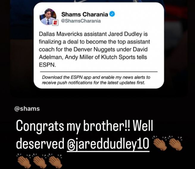 北京时间7月4日,根据ESPN名记Shams Charania报道,前独行侠助教杜德利将与丹佛掘金达成协议,加盟掘金成为首席助教。杜德利的好友詹姆斯通过社媒转发祝贺,毕竟他们是2020年湖人夺冠的队友。